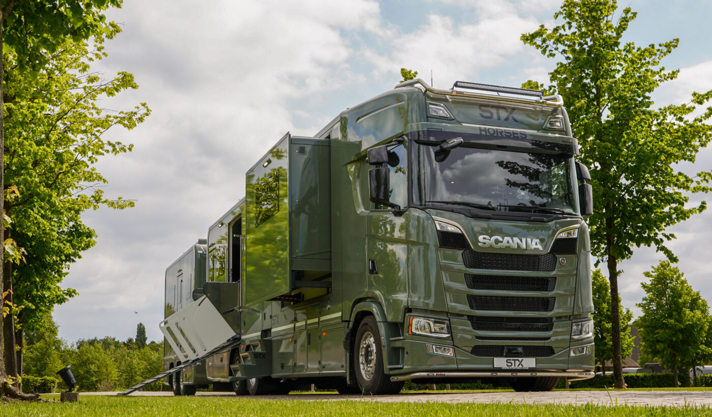 Créé pour combler toutes vos attentes et se surpasser dans sa catégorie. Le STX Scania S et sa puissance de 500 CV est généreux et permet le transport de 4 à 9 chevaux avec une sécurité optimale et une pièce de vie luxueuse pour les passagers. La volonté de STX Horsetrucks : offrir le meilleur confort qui soit pour le conducteur, le passager, et le cheval.