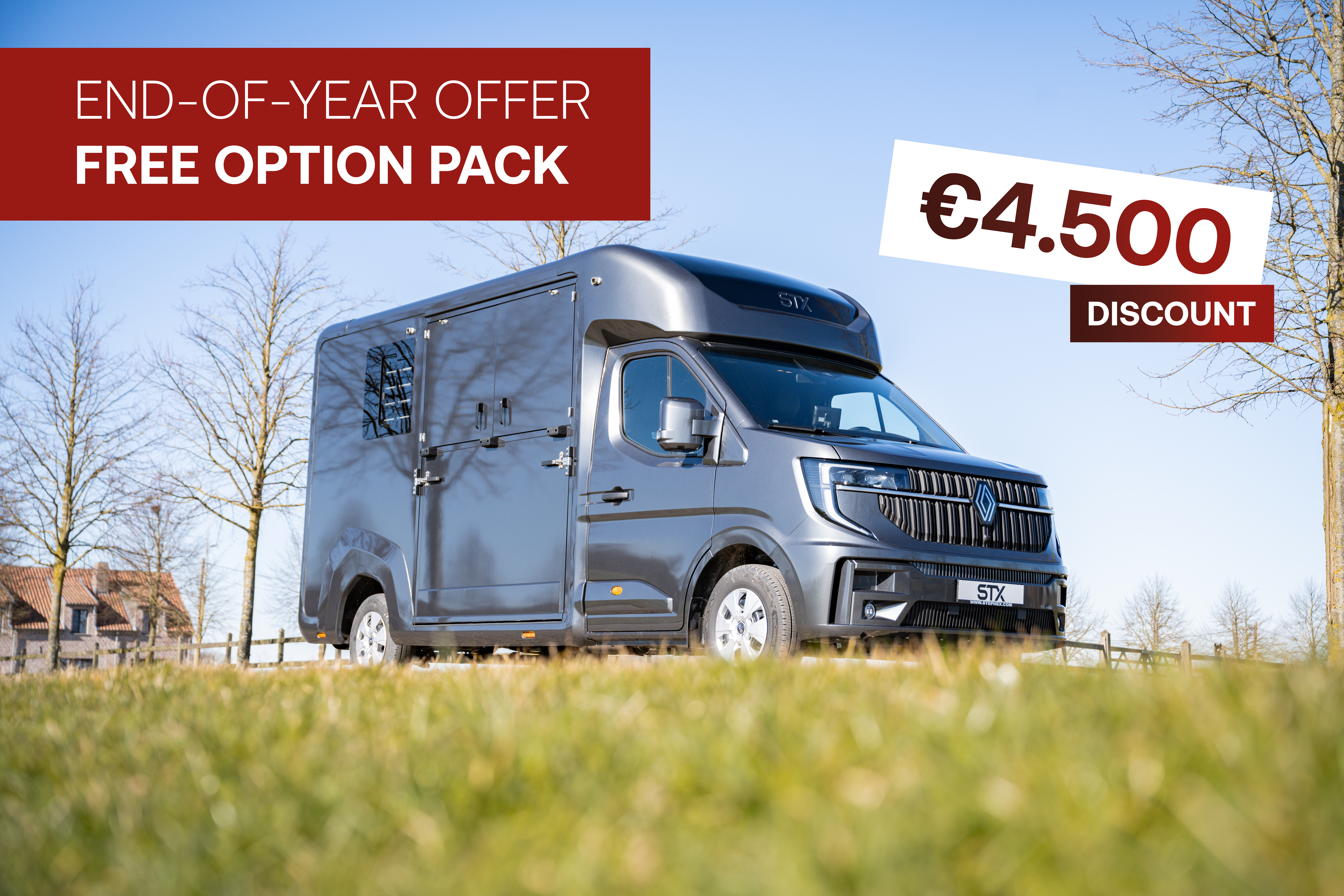 To close the year, we are offering an exclusive end-of-year benefit on the STX 2 Horsetruck. Order your vehicle before the end of the year and receive our complete premium option pack, worth €4,500, included at no additional cost. This pack brings together carefully selected upgrades that enhance comfort, functionality and the vehicle’s visual presence. Included are practical tack area shelving, aluminium wheels for a refined look and smoother driving experience, a rear view camera for added safety and visibility, and the option for custom branding with your own design or logo. Available for a limited time.