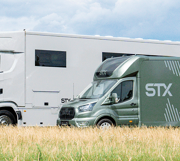 De iconische, klassevolle STX Horsebox straalt elegantie uit. Soepele lijnen, indrukwekkende vormgeving en een aantrekkelijk design, kortom een en al lef. De vrachtwagens zijn gemonteerd op een Mercedes-, Volvo- of Scania-chassis en kunnen tot 9 paarden vervoeren in de beste omstandigheden. Het interieur is modern en ruim en beschikt over alle technologische snufjes. Dat maakt het aangenaam vertoeven in de leefruimte en achter het stuur. Elke vrachtwagen is uniek en geeft een nieuwe betekenis aan elegantie.